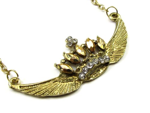 Gold Tone Flying Wings with Crown and Glass Crystals Pendant on Long Chain Necklace Best